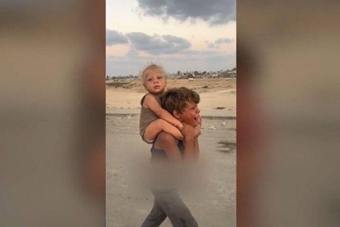 Jadoua, 8, carrega seu irmão Khaled, 2. O vídeo registra o momento em que as crianças fogem após serem separadas de seus pais durante um bombardeio. O ataque foi feito após a ordem do Exército de Israel para esvaziar a Cidade de Gaza.