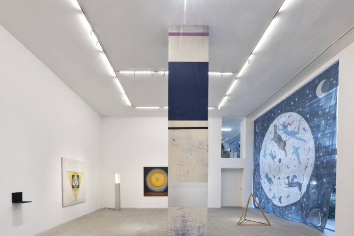 Reconhecida como elemento peculiar do local, uma coluna branca se impõe no centro do salão. Em “Ascensão” ela torna uma espécie de monolito. Entre tons de azul e variações de cinza, cada face da pilastra é revestida por cores diferentes. Pontos brancos sugerem estrelas e rastros de giz lembram um tipo de poeira cósmica.