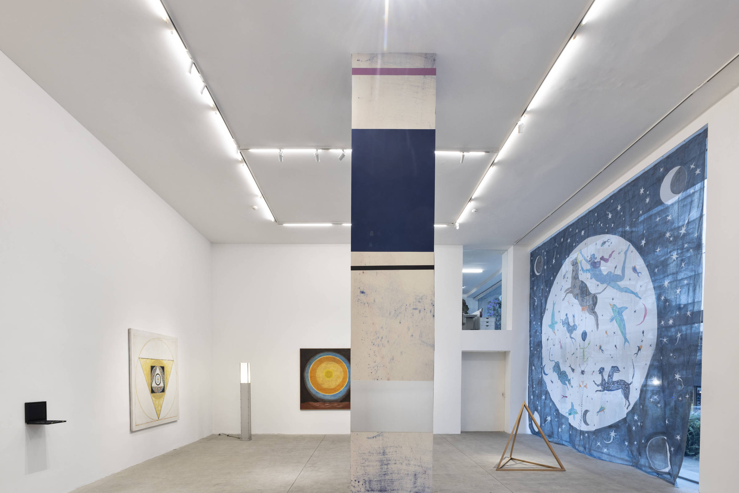 O Sol e a Lua revestem a Gomide&Co em qualquer horário. Pintados sobre enormes cortinas de pano, eles protegem dois janelões de vidro e escondem outras obras da mostra coletiva “Transe”. Seja a estrela que esquenta o planeta, ou a bola em que o homem já andou, desenhos de homens, animais e seres místicos flutuam sobre os astros.
