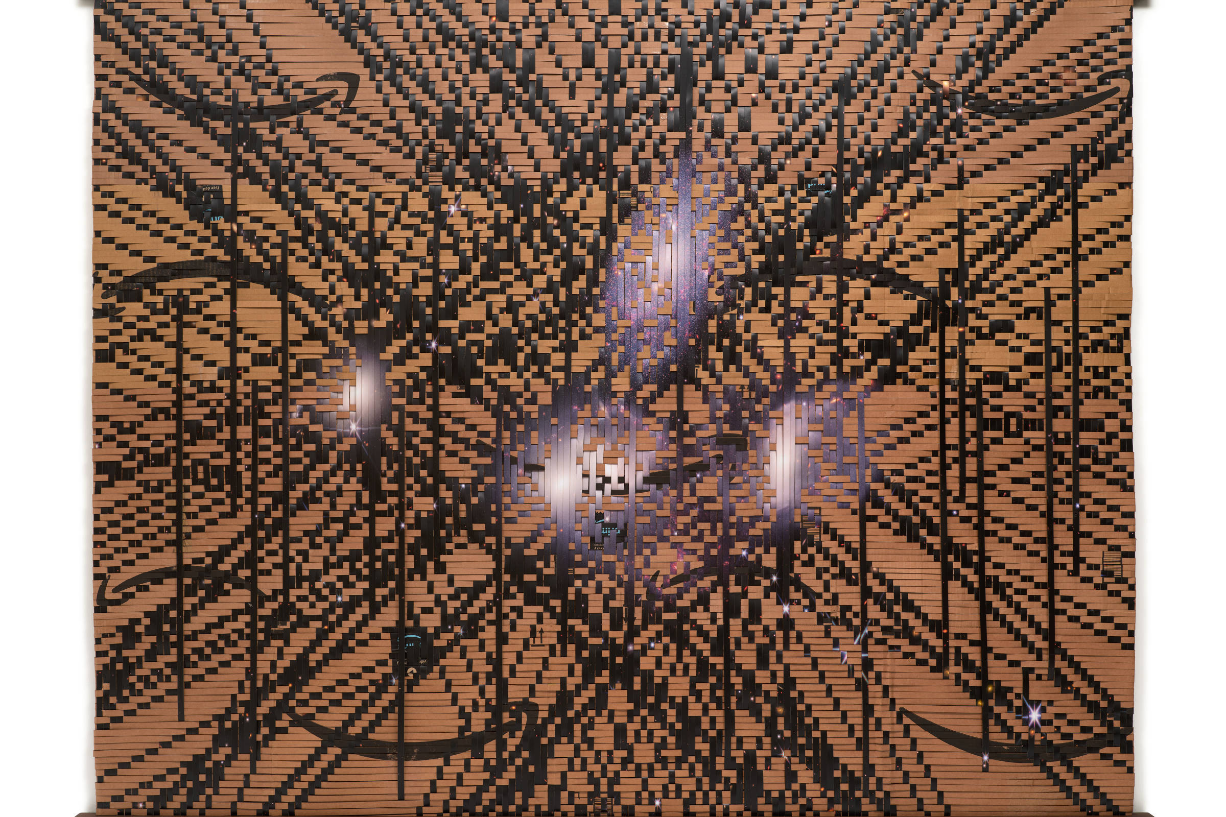 É o que tem feito Jeff Bezos, o dono da Amazon. Em 2000, ele fundou a Blue Origin, empresa voltada à exploração espacial. Inspirada por esse empreendimento, Tossin criou uma tapeçaria entrelaçando recortes de imagens produzidas pela Nasa e tiras de papelão usadas para embalar encomendas da Amazon.