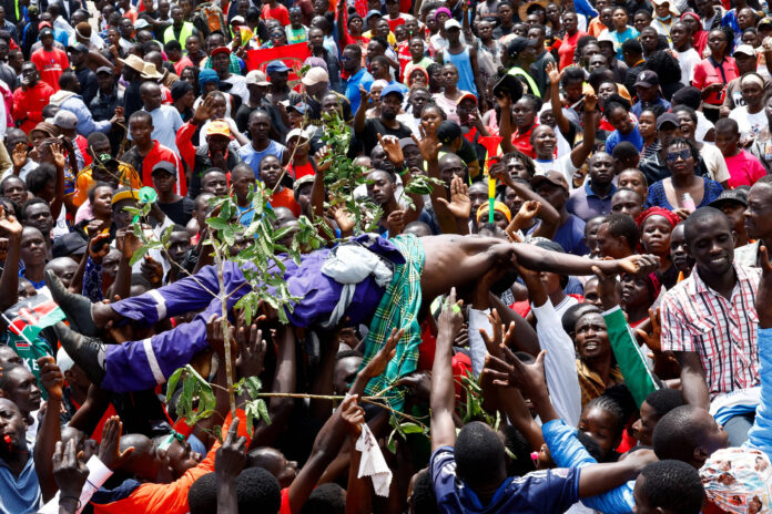 Grandes multidões de pessoas podiam ser vistas chorando, acenando bandeiras quenianas e, em um momento, empurrando-se umas às outras em uma briga no estádio Jomo Kenyatta em Kisumu.