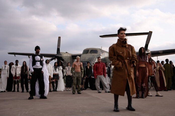 A marca, querida dos descolados paulistanos com sua estética de festa de tecno no galpão em ruínas, desfilou sua nova coleção no aeroporto Campo de Marte, onde há uma aeronave do tipo em exibição —os modelos caminhavam embaixo e ao redor do monstro de metal que serviu à Força Aérea Brasileira.