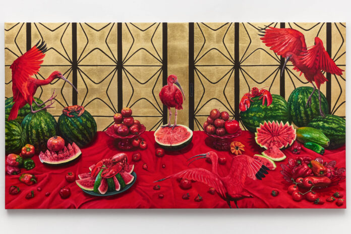 Em outro trabalho de grandes dimensões, onças repousam sobre uma mesa junto a flores e passarinhos que ciscam restos de comida, emoldurados por um jardim em fundo dourado. Já nos quadros menores no começo da mostra vemos frutas como berinjelas e cerejas que ganham um ar de opulência pelo uso das folhas de ouro na composição —é o banal elevado ao luxo.