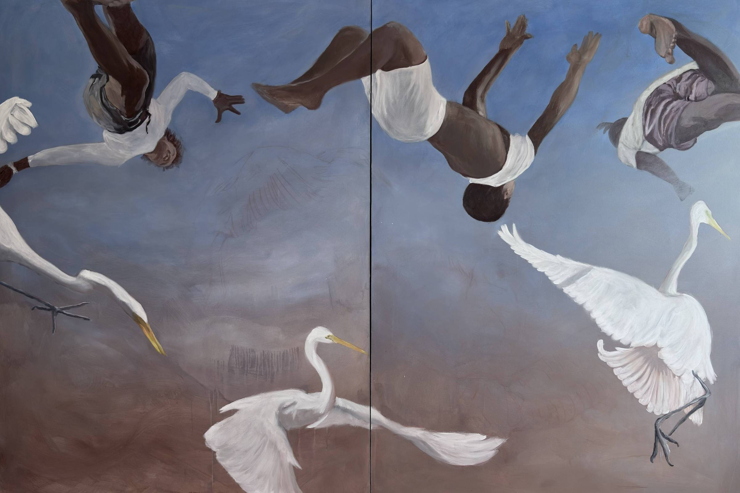 O último eixo, A Radicalização da Imaginação, é o espaço onde o pensamento fanoniano se atualiza como potência criativa de hoje. Entre as obras estão duas pinturas da série “Dialética do Salto”, de Matheus Abu, que mostram a imagem de jovens que saltam ao lado de garças.