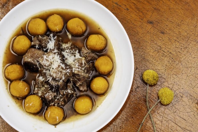 Prato vori vori do restaurante Torto Cozinha leva bolinhos de milho, ossobuco em pedaços e caldo da carne