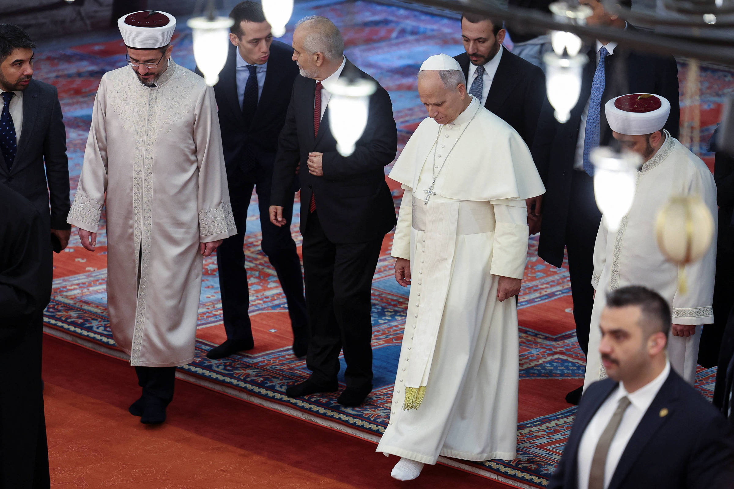 O primeiro papa americano curvou-se ligeiramente antes de entrar na mesquita e foi guiado em um tour no amplo complexo, capaz de acomodar 10 mil fiéis, pelo imã, líder religioso responsável por conduzir as orações e orientar a comunidade, e pelo mufti de Istambul, autoridade especializada em leis islâmicas que emite pareceres sobre questões religiosas e jurídicas.