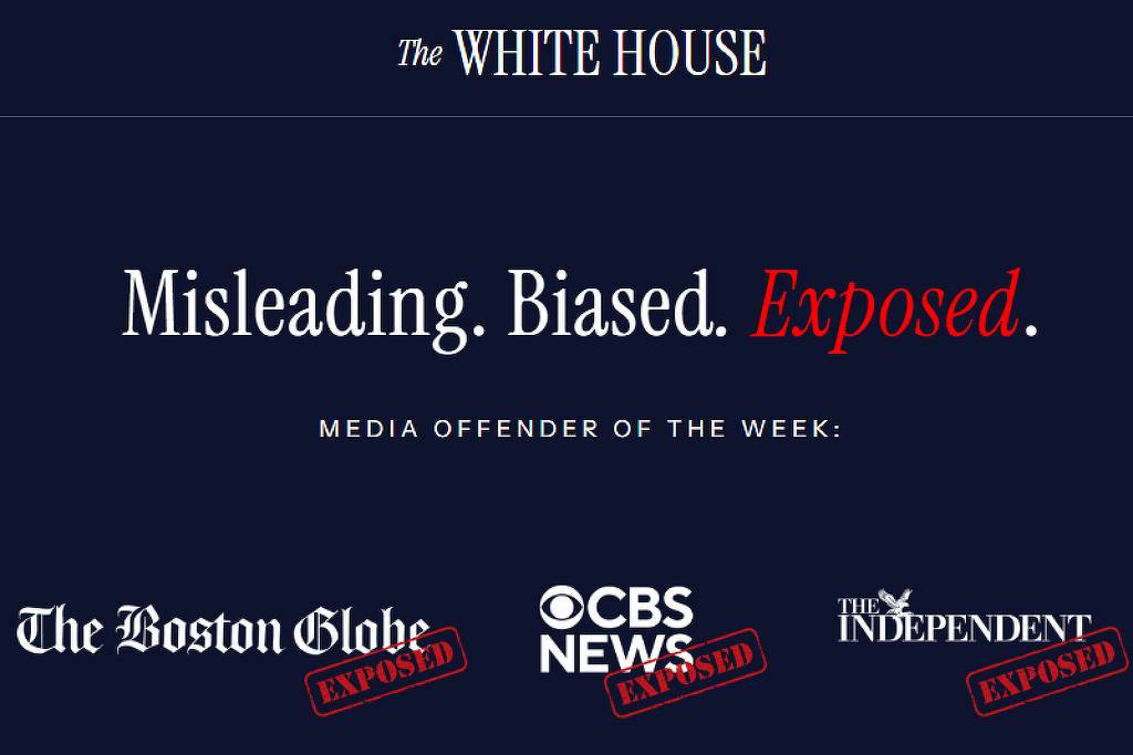 A página, dentro do site do governo, lista os “infratores de mídia da semana” sob uma tarja em que se lê “Enganador. Enviesado. Exposto” e a marca de três veículos de imprensa, como o jornal The Boston Globe, a rede CBS News e o site britânico The Independent.