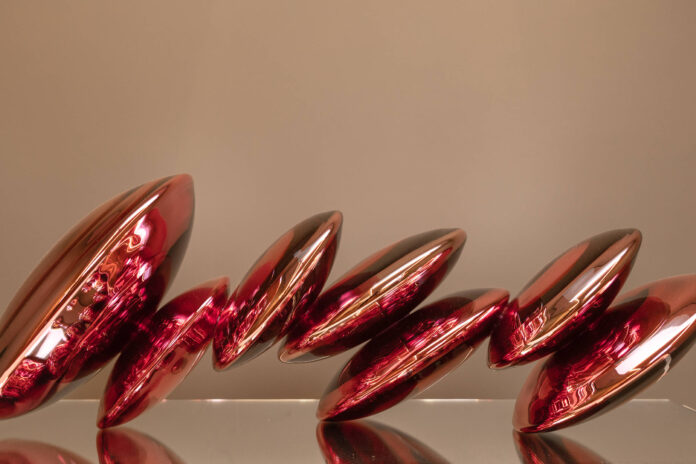 Essas relações se estabelecem também entre as obras e a luminosidade do ambiente expositivo. Isso porque as esculturas refletem a luz do entorno, de modo que pontos luminosos parecem dançar sobre a superfície metálica. “É como se fosse uma sinfonia luminosa”, diz Magalhães.
