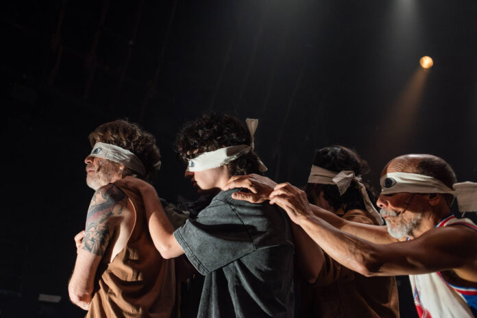 Uma tábua faz o papel de mesa. E, ali, cada ator vai colocando moedas. Há uma luz posicionada sobre eles, que reflete as moedas conforme elas começam a girar. Quando uma delas cai, alguém movimenta a próxima. O som do tilintar do metal na madeira vai crescendo até explodir em uma coreografia de mãos, batendo forte sobre a mesa. A cena do espetáculo “(Um) Ensaio sobre a Cegueira” é de uma simplicidade absoluta. Mas também uma súmula de toda a depuração técnica e estética que se poderia esperar do teatro de quem está na estrada há mais de 40 anos.