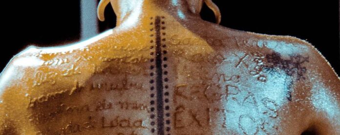 Já a segunda interpretação, “Transcrições Consanguíneas”, apresenta uma leitura realizada por Panamby na qual palavras são inscritas nas costas do artista pelo tatuador Filipe Espindola, que usa uma máquina de tatuar sem tinta, transformando o corpo em paisagem sonora por meio de fricção, vibração e memória. As palavras surgem na pele, escarificadas, criando um texto que nasce do choque entre verbo, som, dor e escuta.