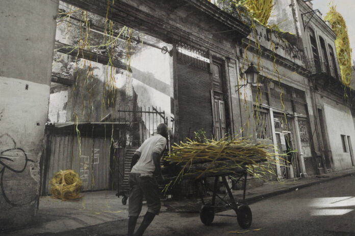 Nas obras apresentadas na Almeida & Dale, a cidade surge como um campo de observação e, ao mesmo tempo, de fricção. A fotografia, para Garaicoa, carrega a promessa de uma realidade imediata, quase objetiva. A pintura e os acréscimos manuais, no entanto, funcionam como dispositivos de ruptura. “A fotografia ancora a obra na realidade, mas a pintura abre uma porta para outro espaço de pensamento, para a ficção, para o sonho —que pode ser fantástico ou terrível”, diz.