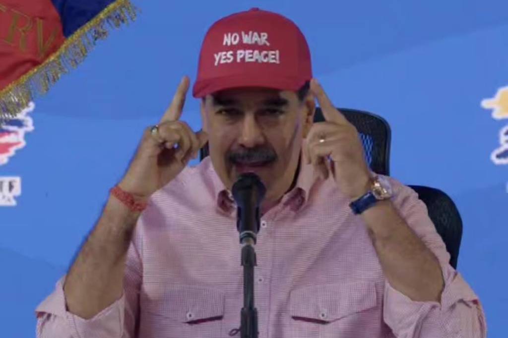 Em meio ao aumento da pressão dos Estados Unidos sobre Caracas, o ditador Nicolás Maduro pediu, em inglês, “No War, Yes Peace” (não à guerra, sim à paz) durante um evento na capital da Venezuela nesta terça-feira (16). Ele também usava um boné vermelho com a frase estampada.