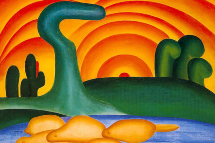 Avaliada em R$ 250 milhões pela Justiça, “Sol Poente” é uma pintura a óleo de 54 por 65 centímetros onde um sol se espalha, em arcos laranjas e amarelos vibrantes, pelo céu de uma paisagem povoada por formas que remetem a cactos e capivaras. Uma das obras mais caras da mestre do modernismo brasileiro, é procurada por museus dentro e fora do Brasil para exposições da pintora.